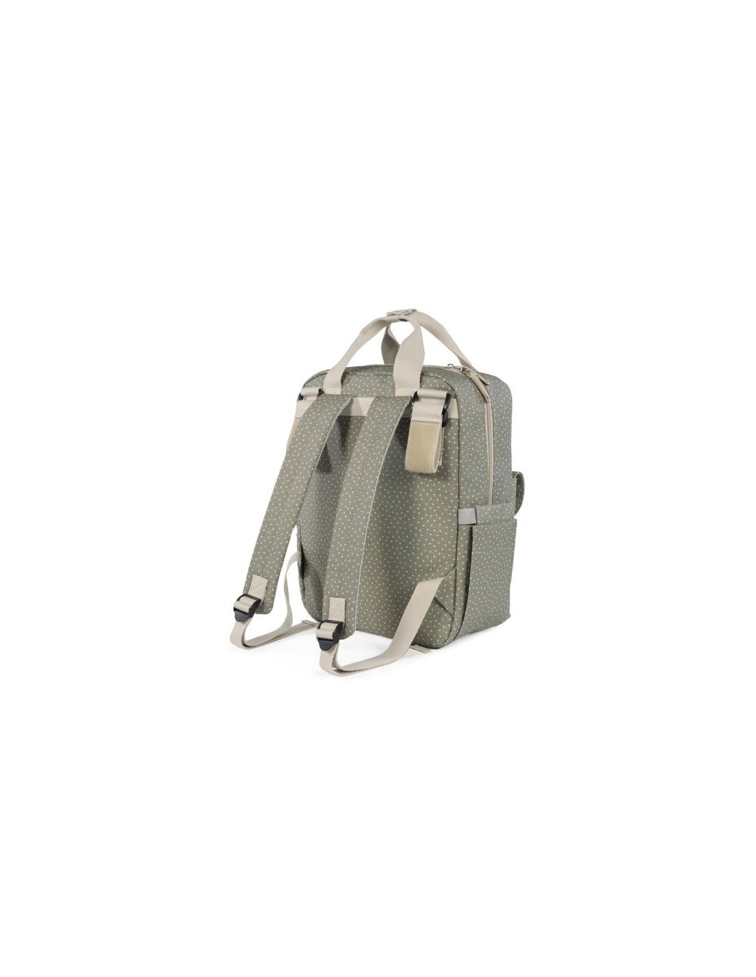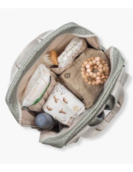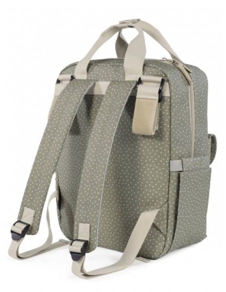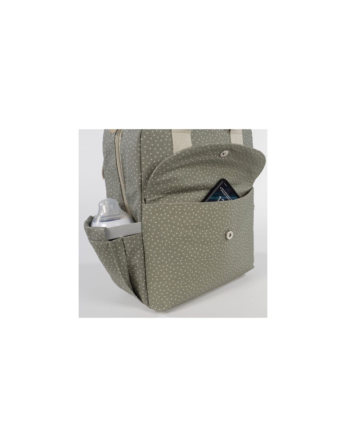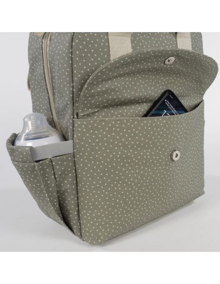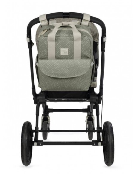 Una bolsa canastilla y mochila al mismo tiempo, muy moderna y urbana, ideal para llevar tus cosas y las de tu bebé, con mucho estilo, a todos sus paseos. La bolsa Poppy Musgo de topitos para silla de paseo es un modelo multifunción muy ligero, resistente y de gran capacidad para llevar todo lo necesario en el paseo del bebe. Su esquema ofrece múltiples bolsillos exteriores e interiores para poder tener todo ordenado y a mano. Tiene bolsillos para guardar los biberones y mantenerlos seguros, elásticos para colocar cubiertos, para las toallitas húmedas, también tiene un funda para la botella de agua y otros más. Incluye un cambiador a juego con el bolso de maternidad y un bolsillo plastificado para almacenar la ropa mojada y aislar la humedad del resto de la mochila. El bolso incluye 2 asas cortas ajustables que facilitan la colocación en cualquier modelo de silla de paseo, asas de mano y correas acolchadas para colgar en los hombros hacia la espalda, sin generar molestias por el peso. Gran calidad y mucho estilo. Fabricada en un material resistente y de fácil limpieza. Walking Mum protege a tu bebé utilizando los mejores tejidos, libres de colorantes azoicos y sustancias nocivas para la salud. Nuestra colección Walking Mum guarda toda la calidad de la marca Pasito a Pasito pero con un particular sello de estilo urbano y moderno que no pasa desapercibido, para vestir diferente los paseos con tu bebé. Las bolsas de maternidad de esta línea son más sport y prácticas, especialmente pensadas en mamás y papás modernos que aprecian los diseños más actuales y en tendencia sin dejar de lado la calidad y la funcionalidad de los accesorios que complementan y hacen más cómodos todos los paseos con sus bebés. Especificaciones: Materiales: 100% algodón plastificado. Medidas: 28X37X12 cm.