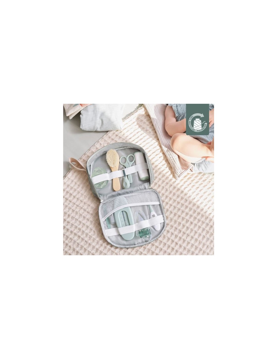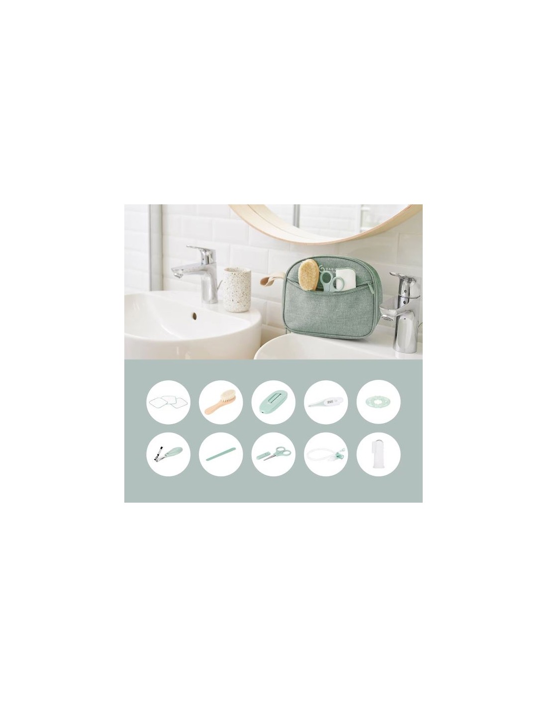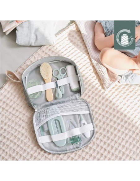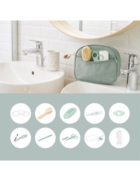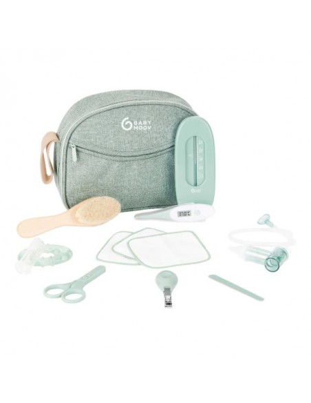 10 accesorios esenciales para el cuidado de tu bebé: termómetro digital con punta flexible, aspirador nasal (con depósito antirretorno para las secreciones), cortaúñas, tijeras de punta redondeada, lima de uñas, termómetro de baño, anillo de dentición refrigerable, cepillo suave de madera FSC® y pelo de cabra, 3 toallitas reutilizables de algodón, cepillo de dientes de primera edad