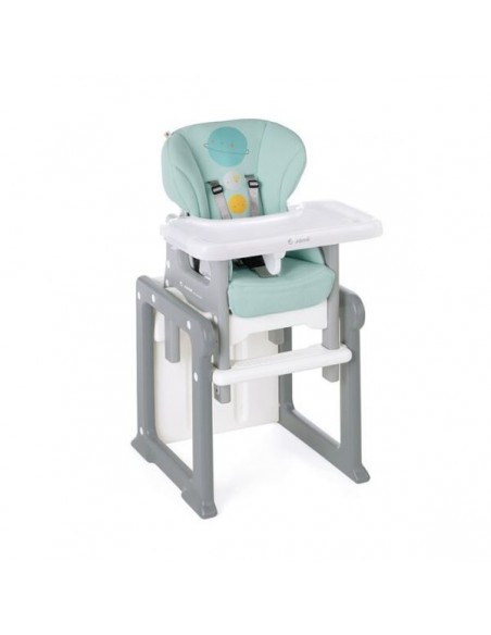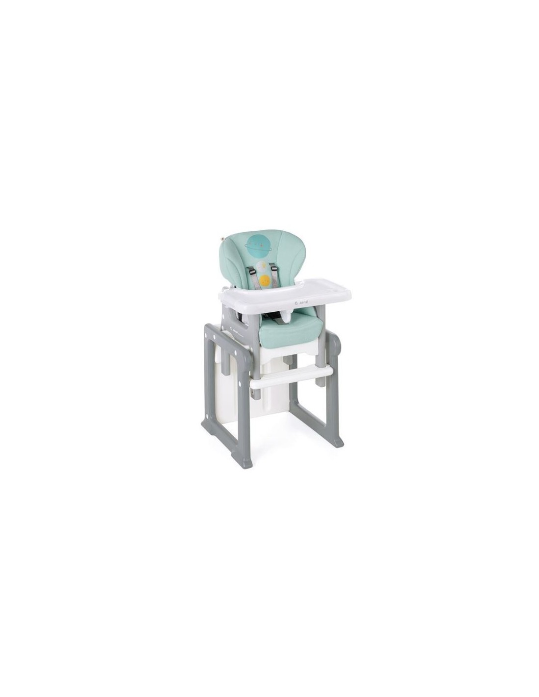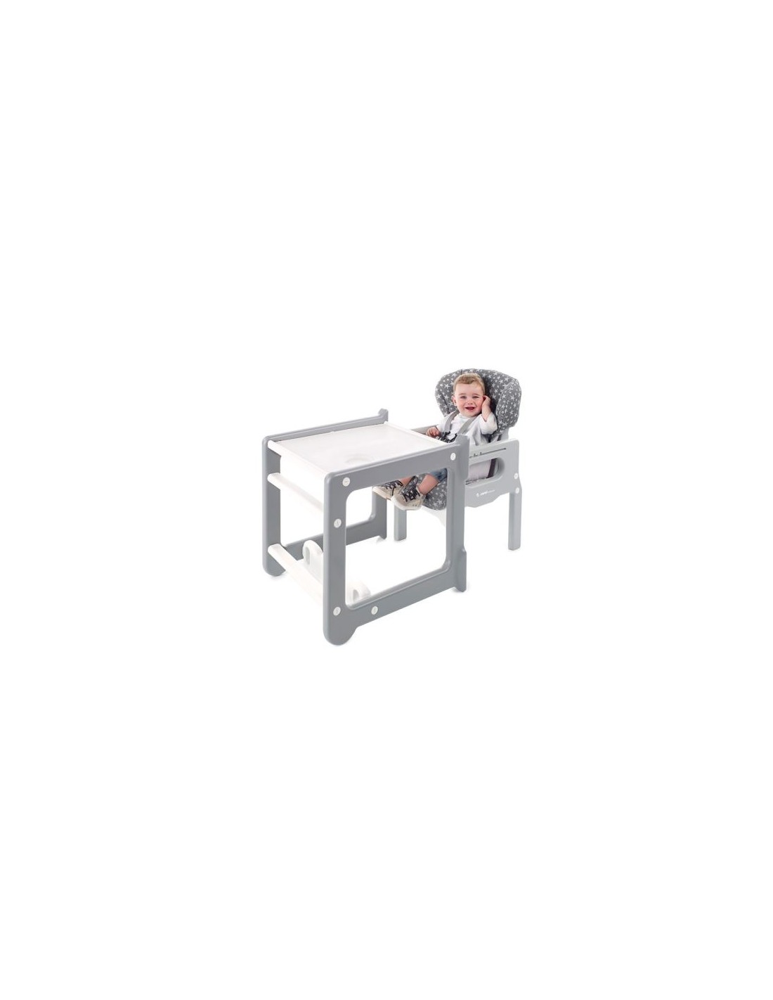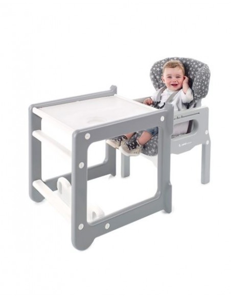 Trona convertible en mesa y silla, con 4 inclinaciones de respaldo y 3 posiciones de bandeja. Sobrebandeja extraíble y tapizado desenfundable.