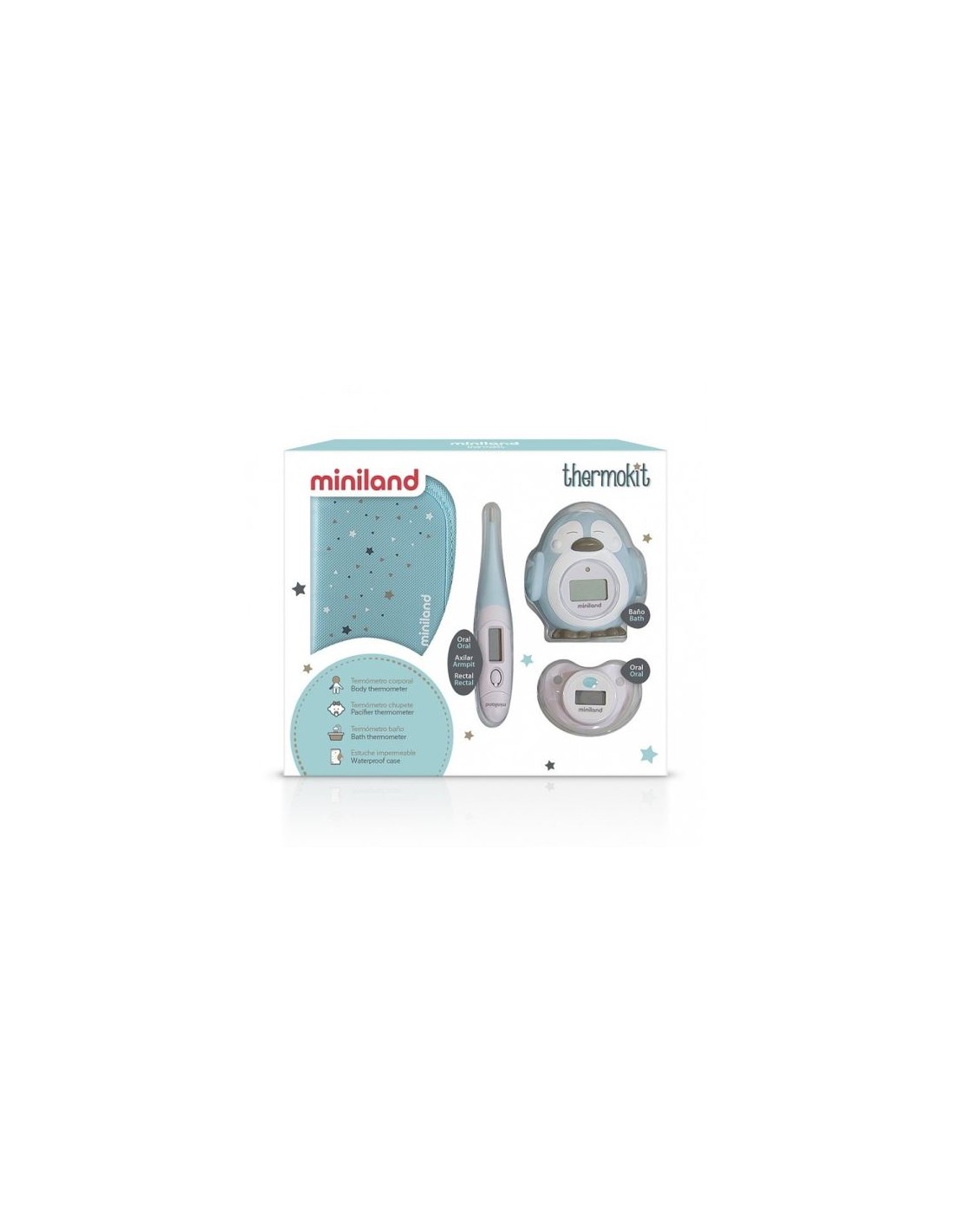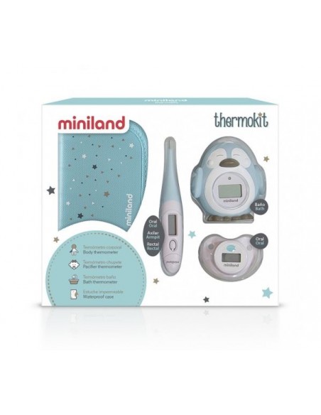 thermokit es un set que ayuda a los papás a controlar cómodamente la temperatura de sus bebés y la del agua. Compuesto por tres termómetros: uno corporal con punta flexible, uno con forma de chupete y otro para el baño. Su simpático diseño lo convierte en el kit ideal para regalar.
